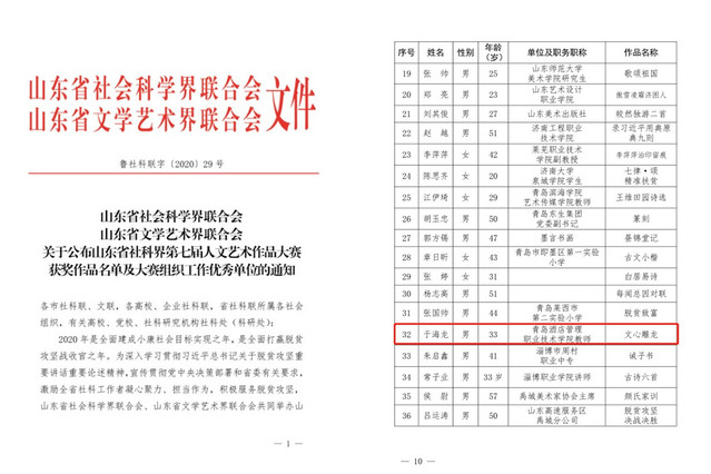 本网讯 (艺术学院 于海龙) 近日,山东省社会科学界联合会、山东省文学艺术界联合会公布了山东省社会科学界第七届人文艺术作品大赛获奖作品名单,学院艺术学院于海龙老师荣获“书法作品入围奖”。