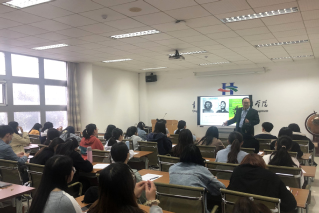 基础教学部于海老师以“漫谈文学与翻译”为主题,向读者讲述了在上海求学、翻译经典著作、“一带一路”援外工作等丰富的人生经历,结合时事政治及当代文化为读者作了深入浅出的讲解。
