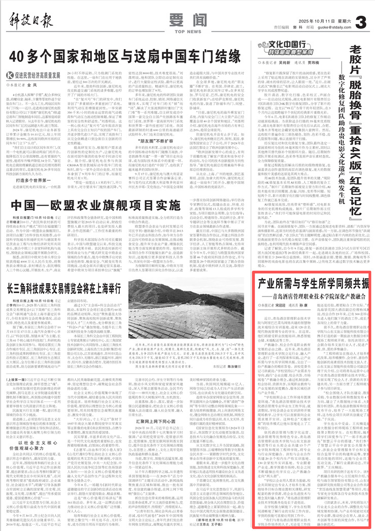 依托酒店管理与数字化运营、旅游管理等优势特色专业,青岛酒店管理职业技术学院与山东文旅游集团等行业头部企业共建13个产业学院和现场工程师学院,将专业与行业深度融合。该校与企业合作共建20余个校内生产性实训基地、130余家校外实训基地。专业跟着产业走,教学围着市场转,校企之间不断碰撞出化学反应,让产教融合走向“两头甜”。