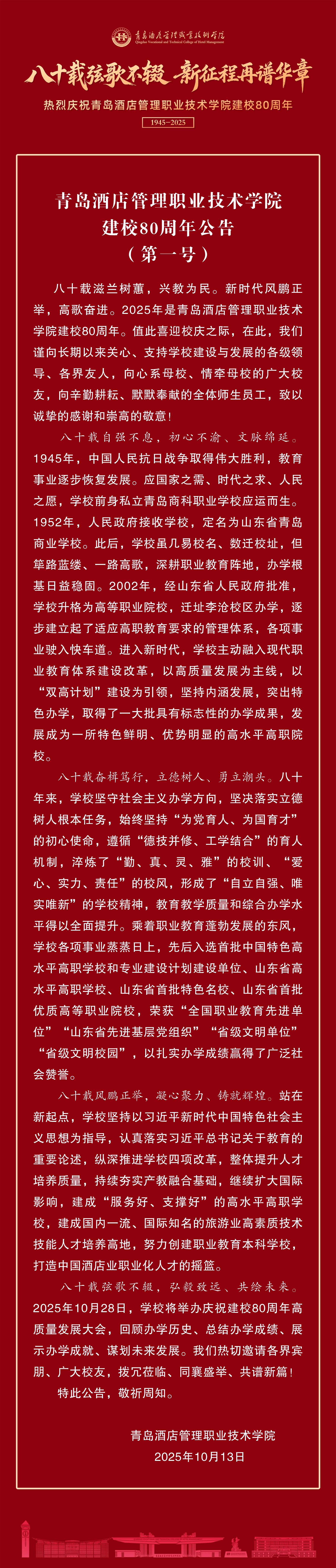 青岛酒店管理职业技术学院建校80周年公告(第一号)