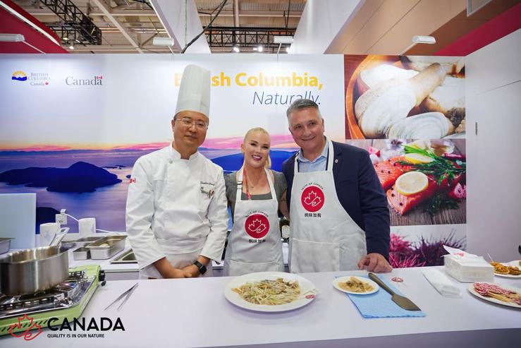 活动期间,我校师生团队设置专属烹饪展示区,现场演绎菜品制作过程,全程负责加拿大海产品的菜品研发与现场推广,通过试吃品鉴、技法讲解等方式向中外观众推广加拿大海产品。加拿大农业部部长麦克唐纳莅临展位视察,亲自参与烹饪环节,与我校西式烹饪工艺专业教师江云涛合作完成数道菜品制作,对我校研发的特色菜品给予高度认可。他表示,本次菜品研发制作活动让更多中国消费者了解加拿大海产品的独特魅力,为中加渔业贸易合作搭建了“美味桥梁”。