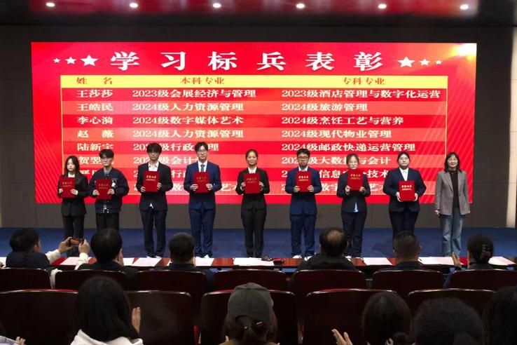 典礼上,姜玲玲为评选出的8名2025年度套读自考本科学习标兵颁发了荣誉证书。教师代表高琳、学习标兵代表及2025级新生代表依次发言,分别从甘做学生的引路人、争创同伴的小标兵、当好自己的主人翁等维度,全面展示了套读自考本科学历提升项目“师生齐心、其利断金”的学习氛围。