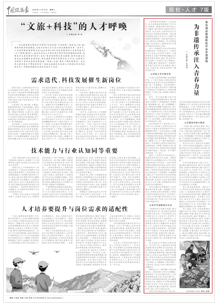 本网讯(宣传部)11月18日,《中国旅游报》以《青岛酒店管理职院开设非遗课程 为非遗传承注入青春力量》为题,报道学校依托非遗课程推动非遗创新传承的经验做法。全文如下: