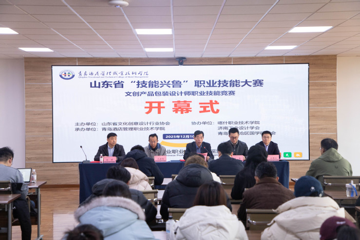 本网讯(文旅学院)12月10日,根据《山东省人力资源和社会保障厅关于组织开展2025年度省级行业职业技能竞赛的通知》和竞赛组委会工作安排,我校顺利举办山东省“技能兴鲁”职业技能大赛文创产品包装设计师职业技能竞赛决赛。山东省文化创意设计行业协会副秘书长杜春,青岛工业设计协会会长、东华大学博士马建伟,青岛大学机电工程学院工业设计系主任赵博等行业专家、裁判代表,我校党委副书记、校长韩西清,全体参赛选手、领队参加开赛式。开赛式由文旅学院院长石媚山主持。