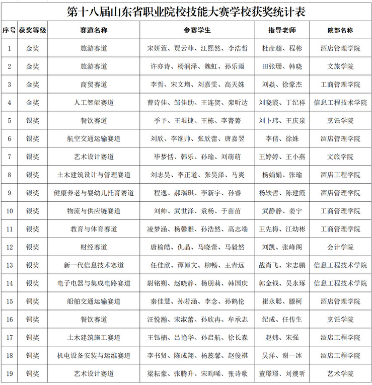 本网讯(教务处)今年12月,第十八届山东省职业院校技能大赛在省内各地陆续开赛,并于近日圆满收官。由我校学子组成的参赛团队勇夺4项金奖、10项银奖、5项铜奖,总成绩位列省内高职院校第一梯队。