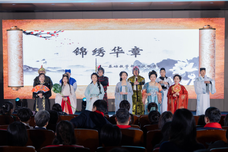 基础教学部的汉服秀《锦绣华章》宛如一幅流动的古典画卷。演员们身着形制各异的传统汉服,步履款款、身姿曼妙,从曲裾的庄重典雅到襦裙的灵动俏皮,从唐装的雍容华贵到明制的端庄大气,跨越不同朝代,让观众仿佛穿越千年,沉浸式感受传统服饰文化的独特魅力。