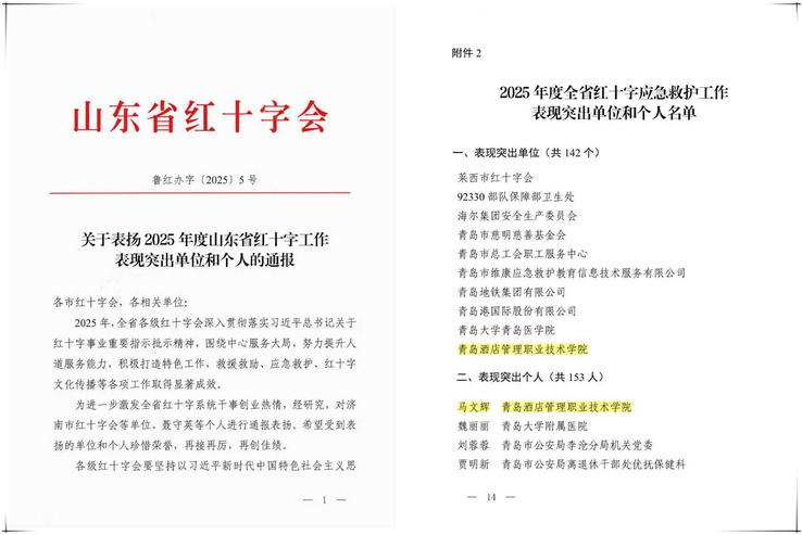 本网讯(总务处 李乔)近日,山东省红十字会印发《关于表扬2025年度山东省红十字系统表现突出单位和个人的通报》(鲁红办字〔2025〕5号),学校作为青岛市唯一一所高职院校荣获“全省红十字应急救护工作表现突出单位”称号,马文辉荣获“全省红十字应急救护工作表现突出个人”称号。