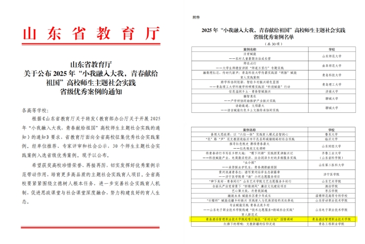 本网讯(团委 文旅学院)近日,山东省教育厅公布了2025年“小我融入大我,青春献给祖国”高校师生主题社会实践省级优秀案例评选结果。我校文旅学院申报的“青岛酒店管理职业技术学院赴喀什地区‘百村计划’国情调研”项目成功入选,这是我校首次斩获该项社会实践省级优秀案例荣誉,彰显了学校实践育人工作的显著成效与丰硕成果。