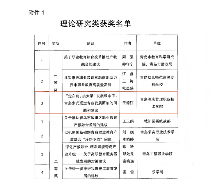 本网讯(统战部 基础教学部)近日,2025年度青岛职教建言献策大赛获奖名单公布,致公党党员、基础教学部教师于德江的成果荣获理论研究类一等奖,成为获此殊荣的三项成果之一。