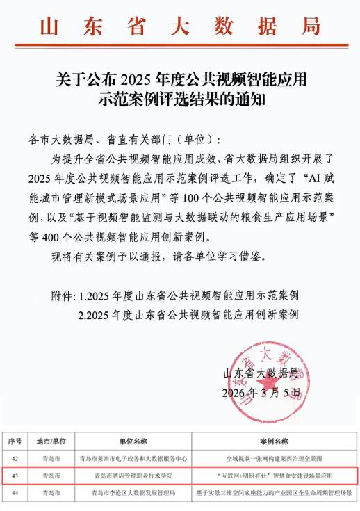 此次入选山东省公共视频智能应用创新案例,是省级部门对我校依托视频智能技术筑牢校园食品安全防线、打造智慧食堂监管模式的充分肯定。未来,学校将持续深化信息技术与校园餐饮管理融合应用,迭代优化智慧监管系统,健全全流程食品安全管控闭环,让“互联网+明厨亮灶”成为守护师生饮食安全、建设健康校园的坚实支撑。