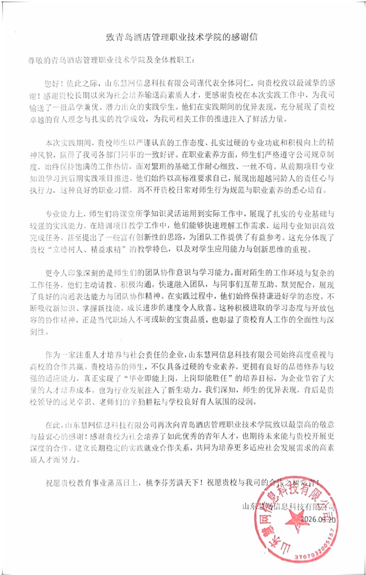本网讯(会计学院 高琳)近日,会计学院携手山东慧网信息科技有限公司共同开展的数智财税技能专项培训项目圆满收官。山东慧网信息科技有限公司发来感谢信,对我校师生在项目中的优异表现给予高度评价。