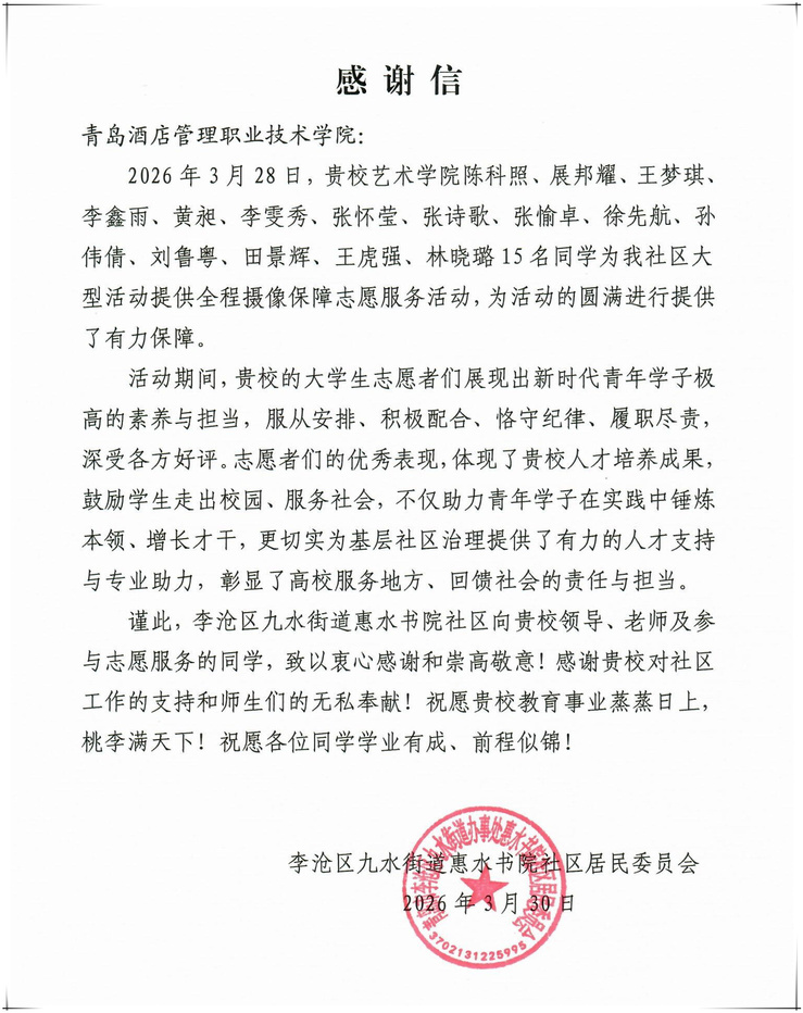 本网讯(艺术学院 邵常恩)近日,九水街道惠水书院社区居民委员特地向学校发来感谢信,对艺术学院“艺心”志愿者们为社区大型活动提供全程摄像保障志愿服务表示感谢,对志愿者们的专业素养与奉献精神给予高度赞誉,彰显了学校育人工作的扎实成效。