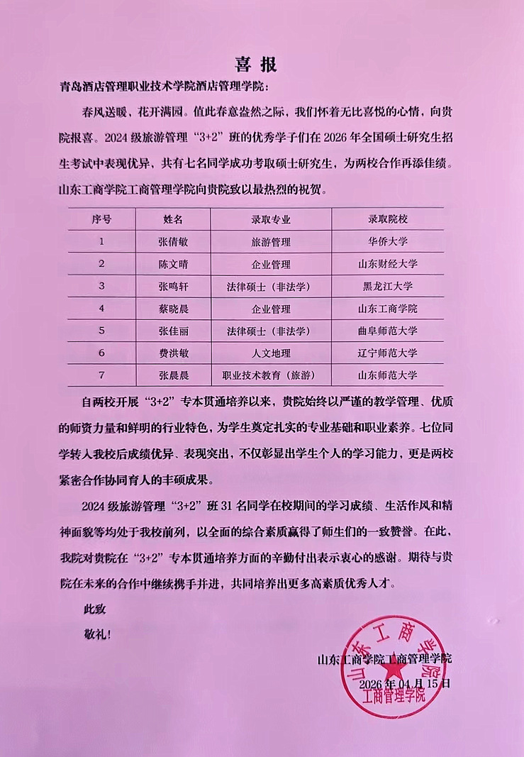 本网讯(酒店管理学院)4月15日,山东工商学院工商管理学院向酒店管理学院发来喜报,热烈祝贺我校2021级酒店管理与数字化运营专业专本贯通班在2026年全国硕士研究生招生考试中斩获佳绩——全班31名学生中有7人顺利考取硕士研究生,上线率达22.6%,录取率稳居山东工商学院旅游管理专业毕业班前列。
