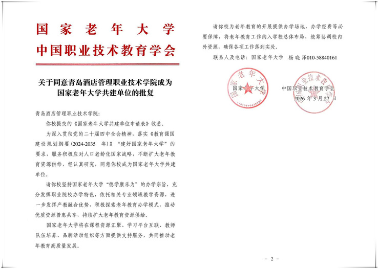 本网讯(酒店管理学院 杨轶哲)近日,国家老年大学、中国职业技术教育学会联合发文公布国家老年大学共建单位名单,我校成功入选。这是学校在服务国家积极应对人口老龄化战略、深耕老年教育与康养人才培养领域取得的重要进展。