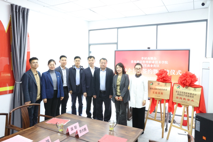 会上,李沧区商务局党组书记、局长李大鹏,我校艺术学院院长朱广丽为“政校企联创城市美学实践基地”揭牌;李沧区李村街道人大工作室主任刘文涛、我校艺术学院党总支书记王莹为“商业文化街区形象设计典型生产实践项目实践教学点”揭牌。