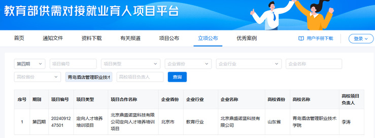 本网讯(文旅学院)近日,教育部公布第四期供需对接就业育人项目名单,文旅学院申报的《北京鼎盛诺蓝定向人才培养培训项目》入选。