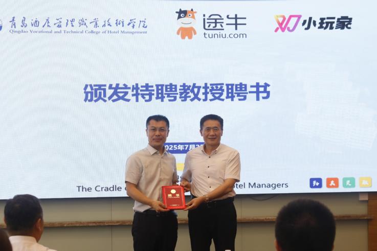 仪式上,刁洪斌、辛守东为途牛订单班揭牌。姜玉鹏为辛守东颁发学校特聘教授聘书并对双方的合作以及订单班全体学生提出期望与要求,他表示,途牛是在线旅游和文旅直播行业头部企业,双方深度合作能够充分实现联合共育、科技共赢、成果共享。