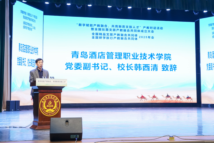 在我校主办的全国精品文旅产教融合共同体、全国研学旅行产教融合共同体2025年会上,来自国内知名旅游院校、行业企业的百名嘉宾参会。全国旅游行指委副主任委员周春林、华南师范大学旅游学院院长刘俊、旅游教育出版社副社长丁海秀等专家围绕教师教学能力比赛、研学旅游新业态发展和职业教育教材建设分别作了主旨演讲。会上,我校文旅学院院长石媚山发布了新国标系列教材项目,途牛旅游网校企项目负责人陈芳发布了旅游直播产教融合项目,山东文旅云智能科技有限公司副总经理于庆分享了与我校共建的山东省首批旅游大数据分析师现场工程师专项人才培养项目。喀什职业技术学院、安顺职业技术学院代表分别围绕规划教材建设和技能大赛作品设计分别作了交流分享。